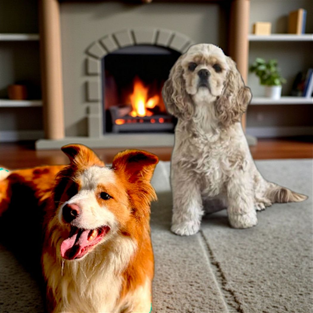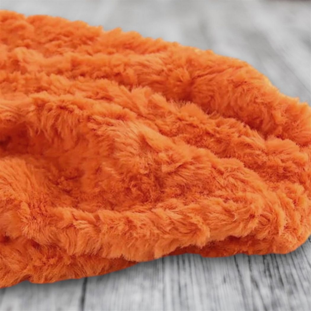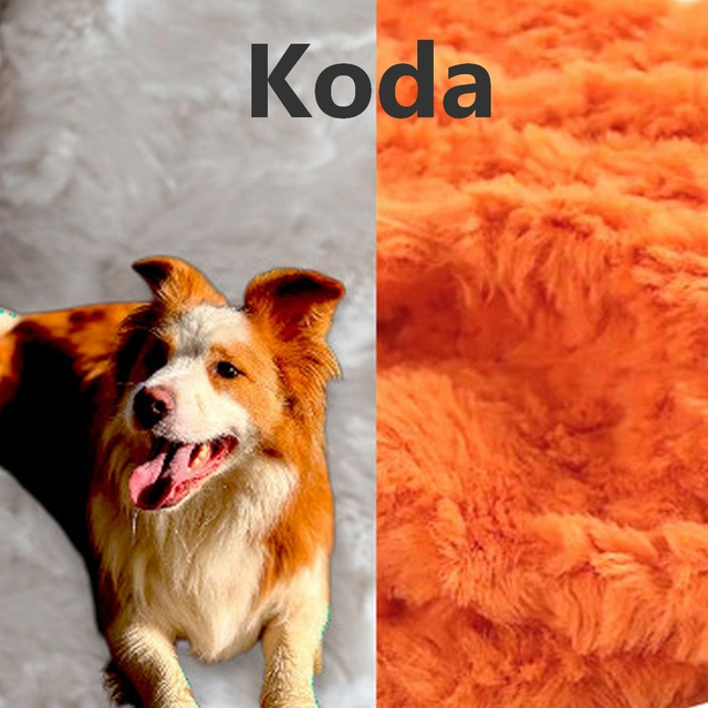 Border collie roux broderie Koda tissus fourrure texturée orange et blanc cassé.